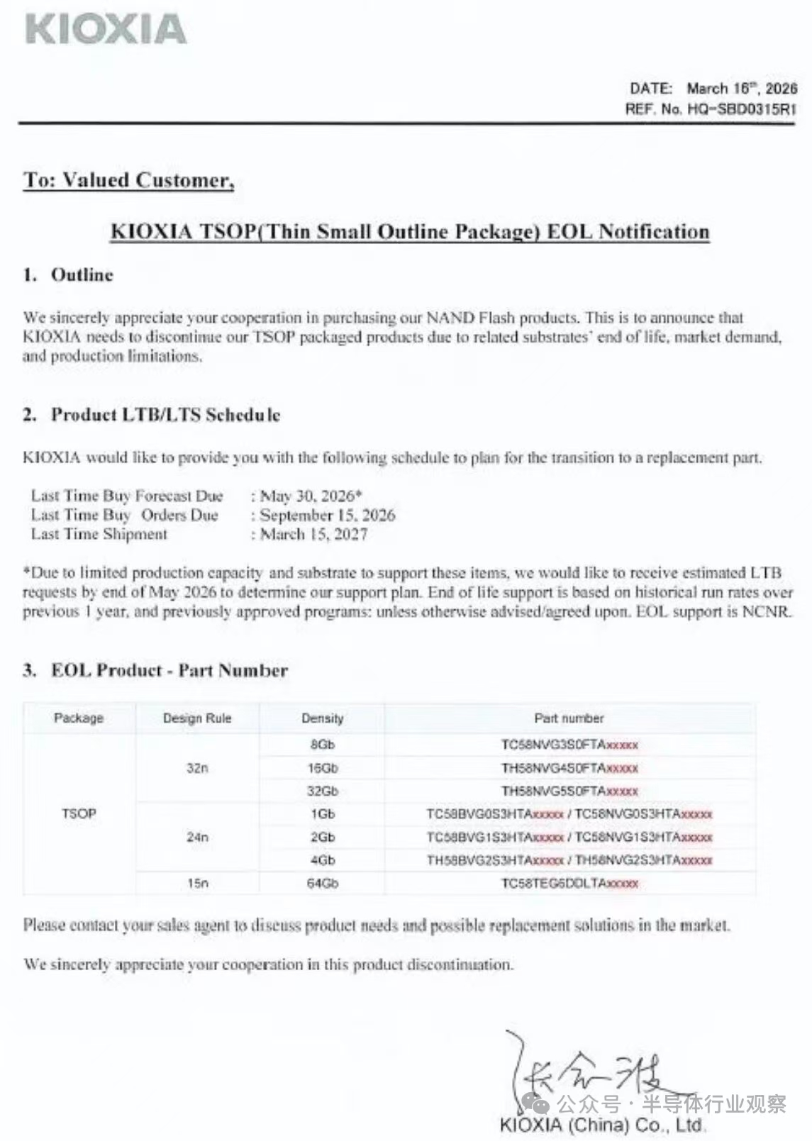 On March 19, 2026, Kioxia officially issued an EOL (End-of-Life) notice for its Thin Small Outline Package (TSOP) NAND Flash products. This massive exit from the low-density MLC NAND market (8Gb to 64Gb) is sending shockwaves through the industrial, medical, and automotive sectors.